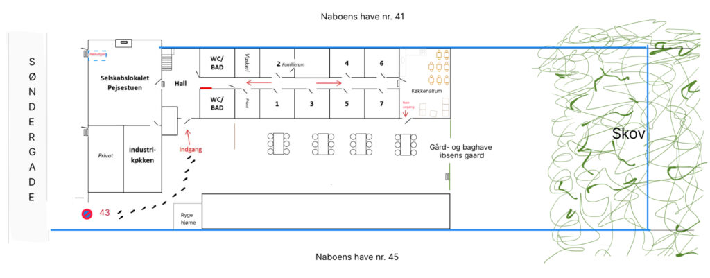 Her kan du se hvordan ibsens gaard er placeret i villakvarteret på Søndergade og hvilke vej du kan gå for at komme til havnen, stranden, restauranter og seværdigheder. Længere nede findes en plantegning over værelserne i stueetagen.